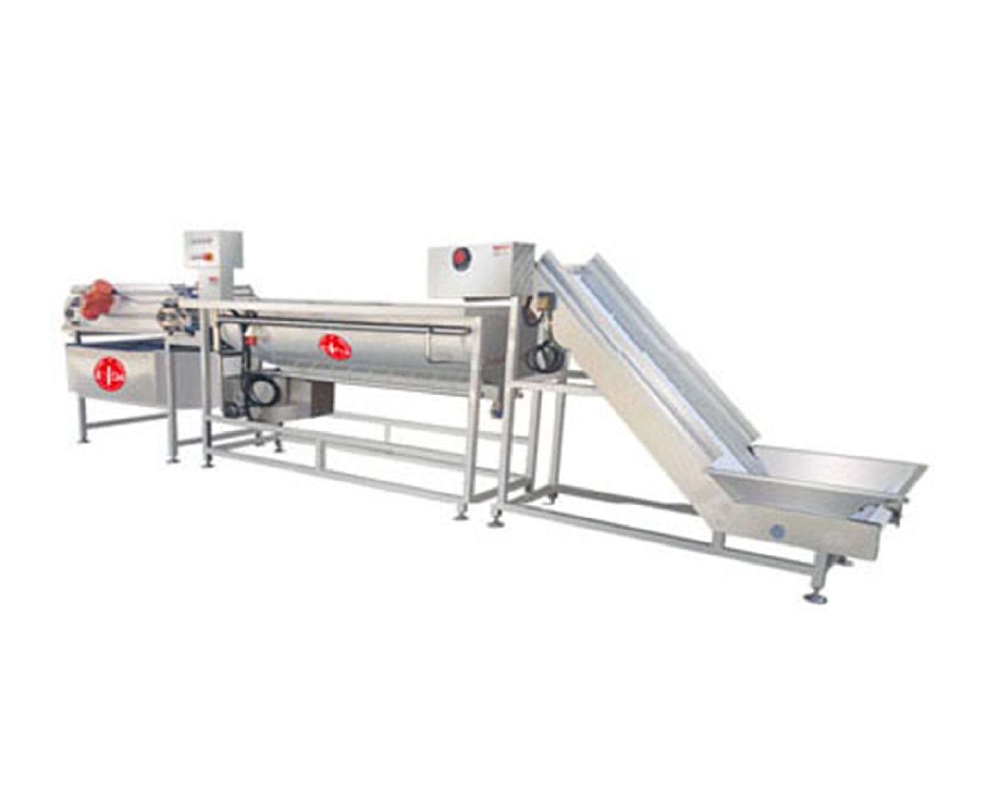 有提升機(jī)和旋流式洗菜機(jī)和震動(dòng)輸送機(jī)這三部分組成。缸底布置高壓注氣管,高壓氣泡能夠有效分離成團(tuán)的蔬菜,旋流管更加裝調(diào)壓閥以控制旋流,以適應(yīng)清洗不同大小/重量物料時(shí)調(diào)整強(qiáng)度。360度循環(huán)翻轉(zhuǎn)按摩式清洗+10支高壓可調(diào)氣泡震動(dòng)清洗,雙重潔凈清洗無論是整菜還是切好的段菜,碎菜,均能輕松應(yīng)付.缸體內(nèi)部真正光滑半圓式設(shè)計(jì),蔬菜在缸體內(nèi)部旋流清洗進(jìn)程中只有持續(xù)的氣泡震動(dòng)作用于蔬菜表面,沒有缸內(nèi)突出的水流噴口,避免物料清洗中的多次碰撞損傷,真正做到對(duì)蔬菜、果蔬洗凈過程中的加倍保護(hù),避免受到細(xì)微損傷。采用振動(dòng)式輸送替代傳統(tǒng)輸送帶式輸送,結(jié)構(gòu)更簡(jiǎn)單,比傳統(tǒng)輸送帶減少清洗時(shí)間使用更方便。采用進(jìn)口減震臂,保證在持續(xù)穩(wěn)定的低頻震動(dòng)輸送過程中,有效瀝除多余水分,并為下一道脫水工序提供預(yù)脫水功能。